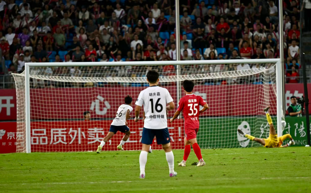 31分钟,替换上场的卢则灵从左路突入禁区,将球传至右路,37号潘雨生一脚劲射,球打在横梁上弹出。