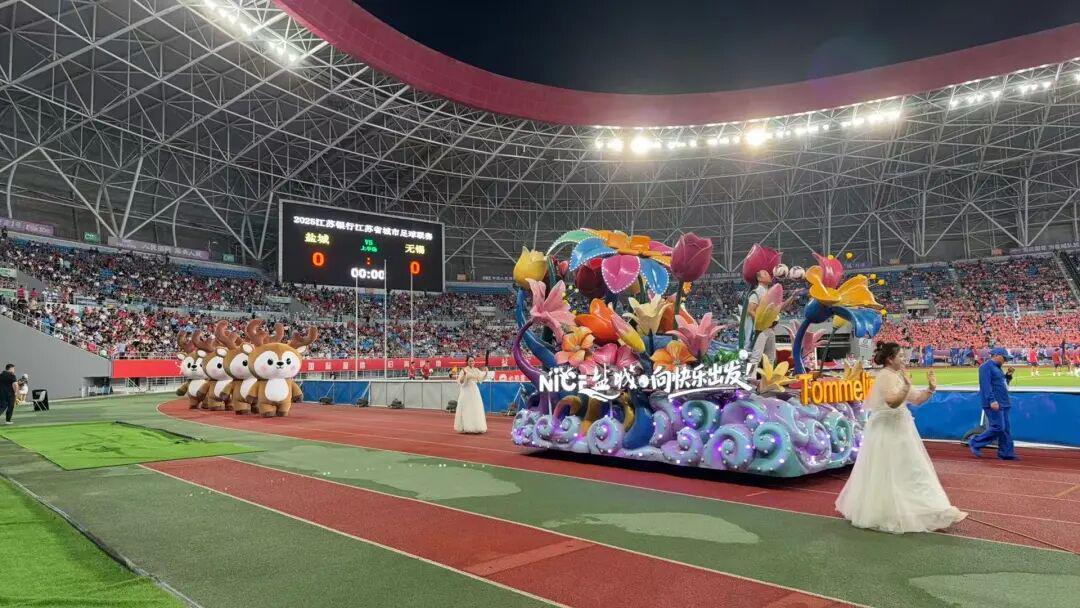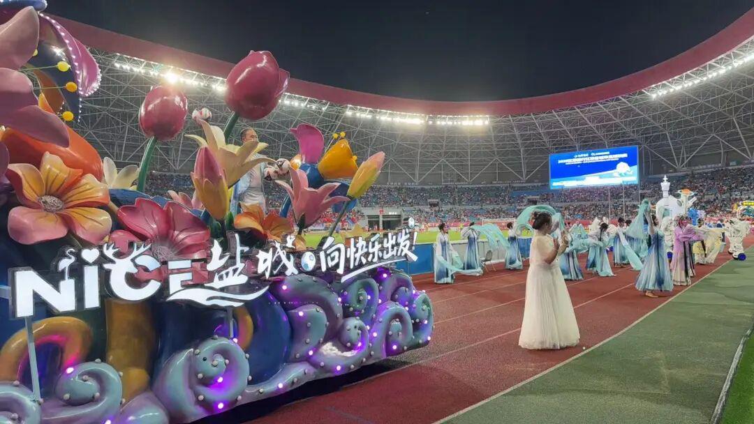 盐城把“文化家底”搬进了球场,在15分钟的篇章里,盐城的文化元素如海浪般层层递进,湿地风光、海盐文化随花车巡游缓缓铺开,淮剧以原汁原味的唱腔展现非遗的魅力,杂技表演招招惊险刺激,航天表演科技感十足,“太空漫步”把日月岛元素生动地搬到了比赛现场。朱哲琴专程来到球场,倾情演唱成名曲《一个真实的故事》。